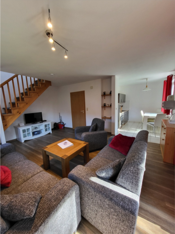 Außerdem ist das Haus ausgestattet mit Küche, Essbereich, Wohnzimmer, Badezimmer, HWS mit Waschmaschine sowie Trockner verteilt auf 2 Etagen.